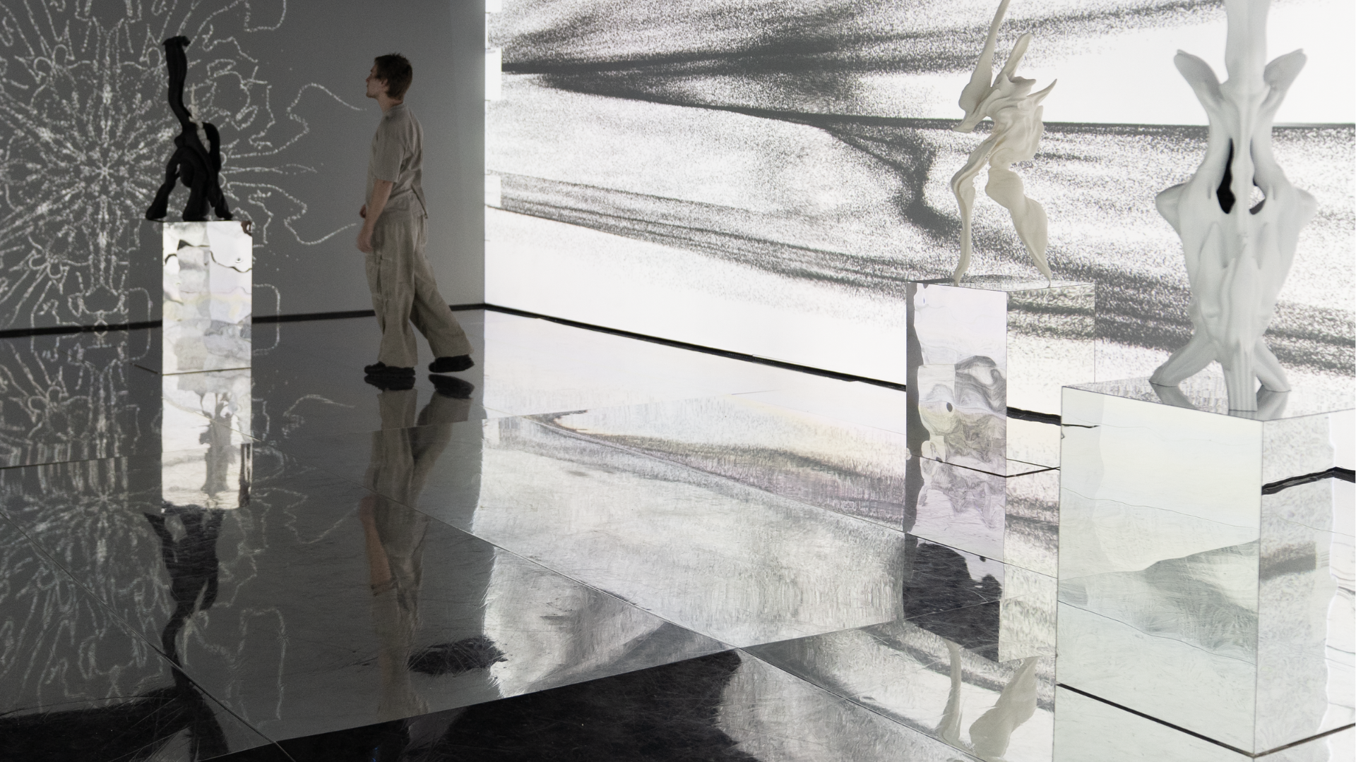 “Devenir urdimbre” fue una instalación inmersiva que entrelaza escultura, visualización digital y composición sonora para desplegar un campo perceptivo en constante vibración. Las esculturas, diseñadas e impresas por Manel Bafaluy, habitan el espacio como cuerpos orgánicos y abstractos que condensan una energía latente. Cada forma se encarna con una tensión activa, una presencia que se abre a la resonancia. Una nube de puntos, programada por Marco Ferreira, recorre la sala proyectando figuras lumínicas que evocan rosetones líquidos: patrones fugaces que articulan el espacio como si la materia misma se tejiera en luz. El paisaje sonoro de Eddgem envuelve la experiencia con capas de frecuencia y profundidad, insuflando aliento al conjunto y haciéndolo reverberar.