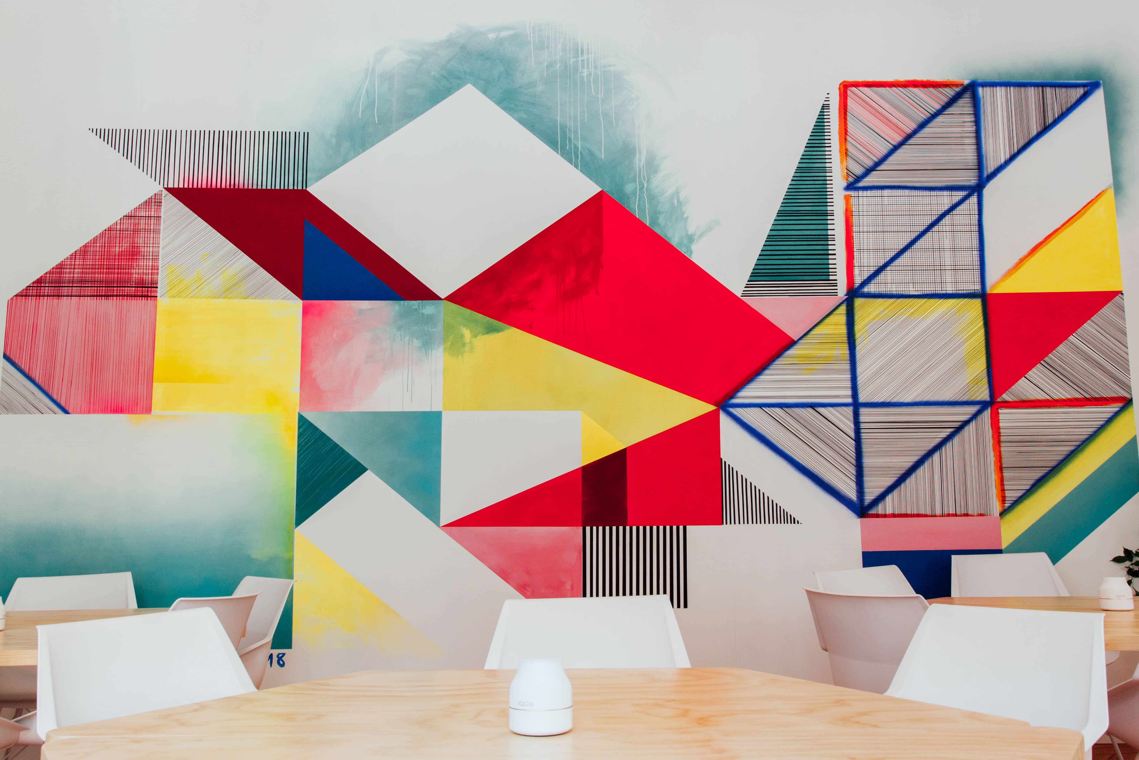Para el Co_lab Café, Anna Taratiel creó una intervención artística permanente en la que plasmó una obra de carácter geométrico experimental donde la chromatica y las formas nos llevaron a sentir una pieza en conjunto que se conformó como un punto generador vital dentro del espacio del co-working.