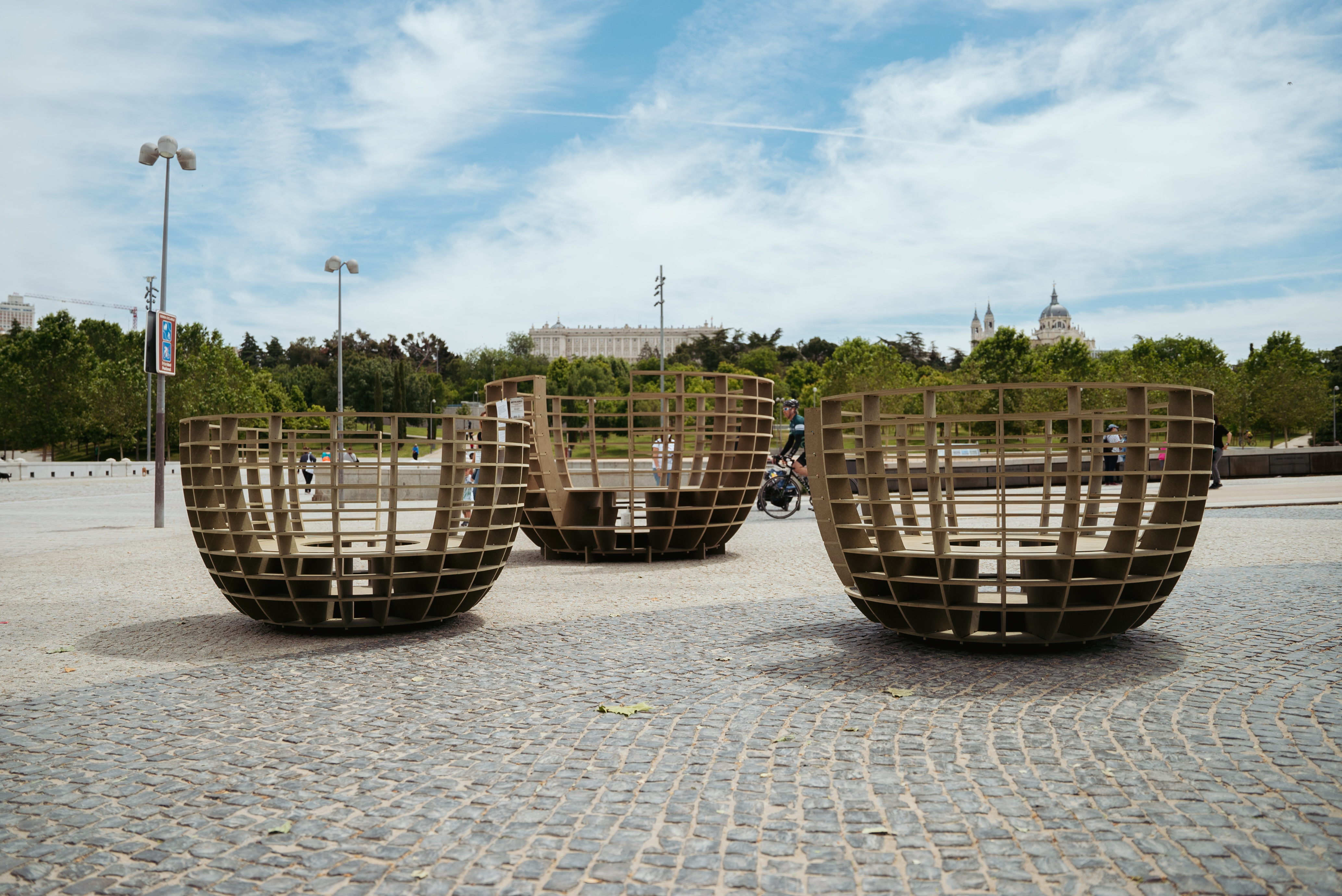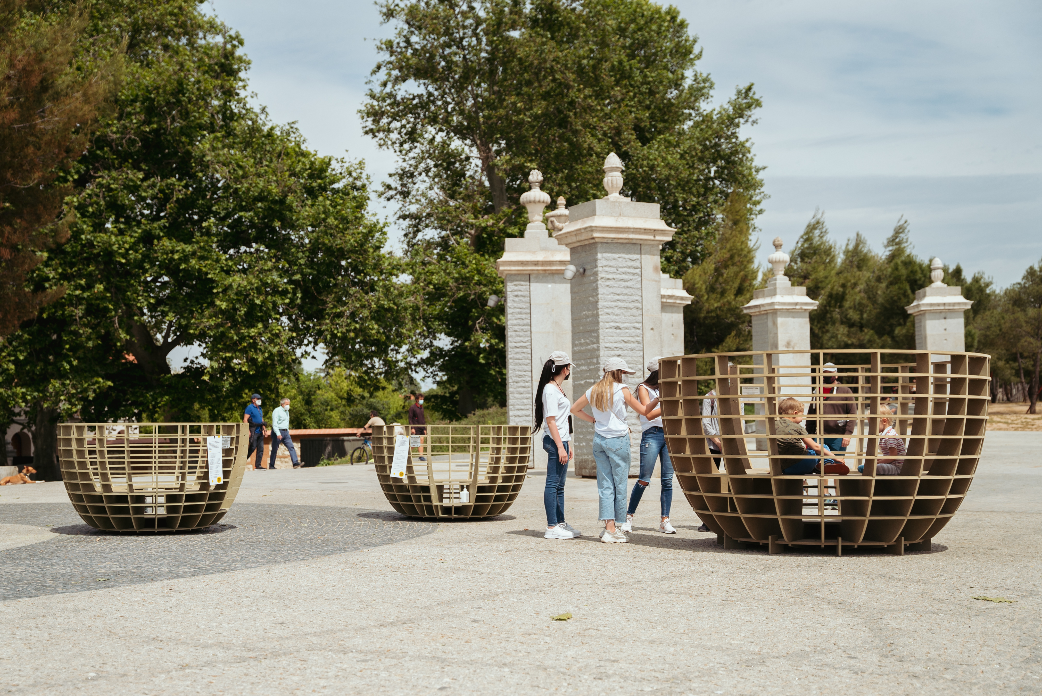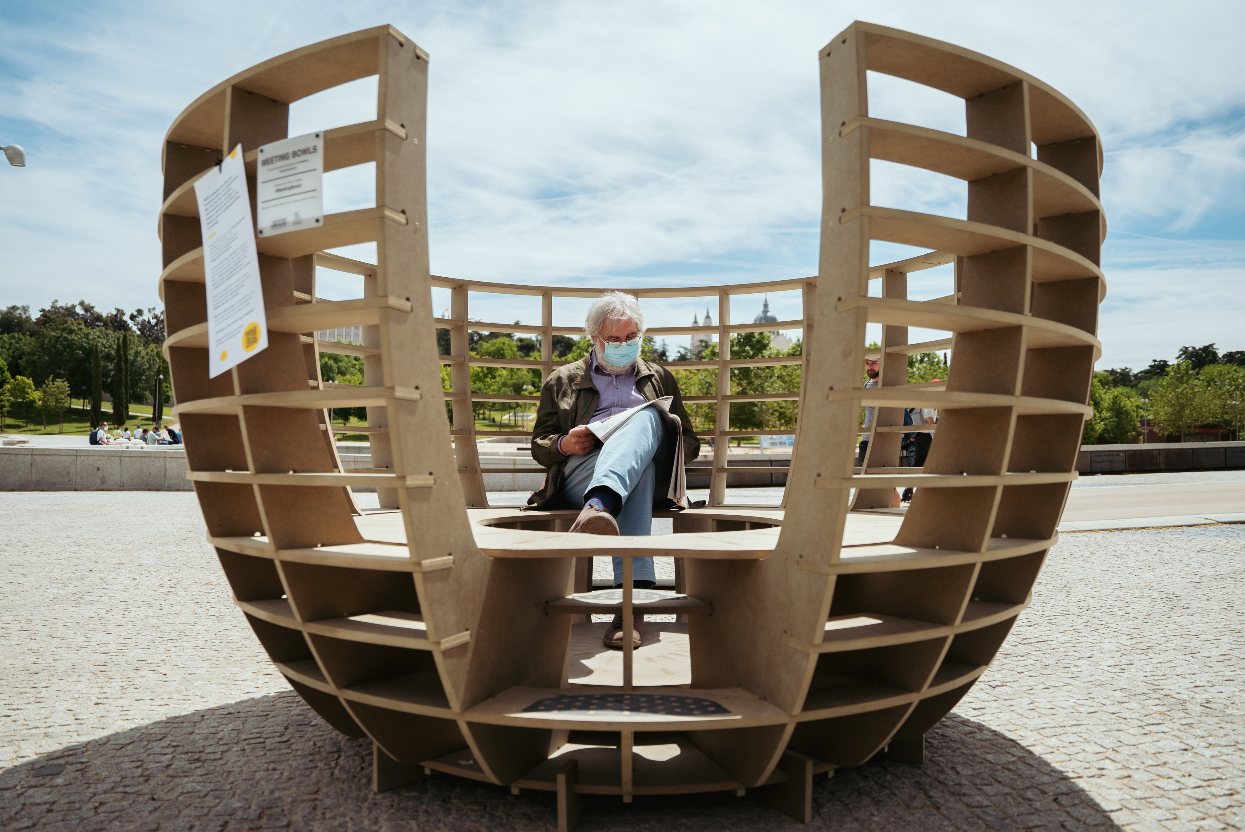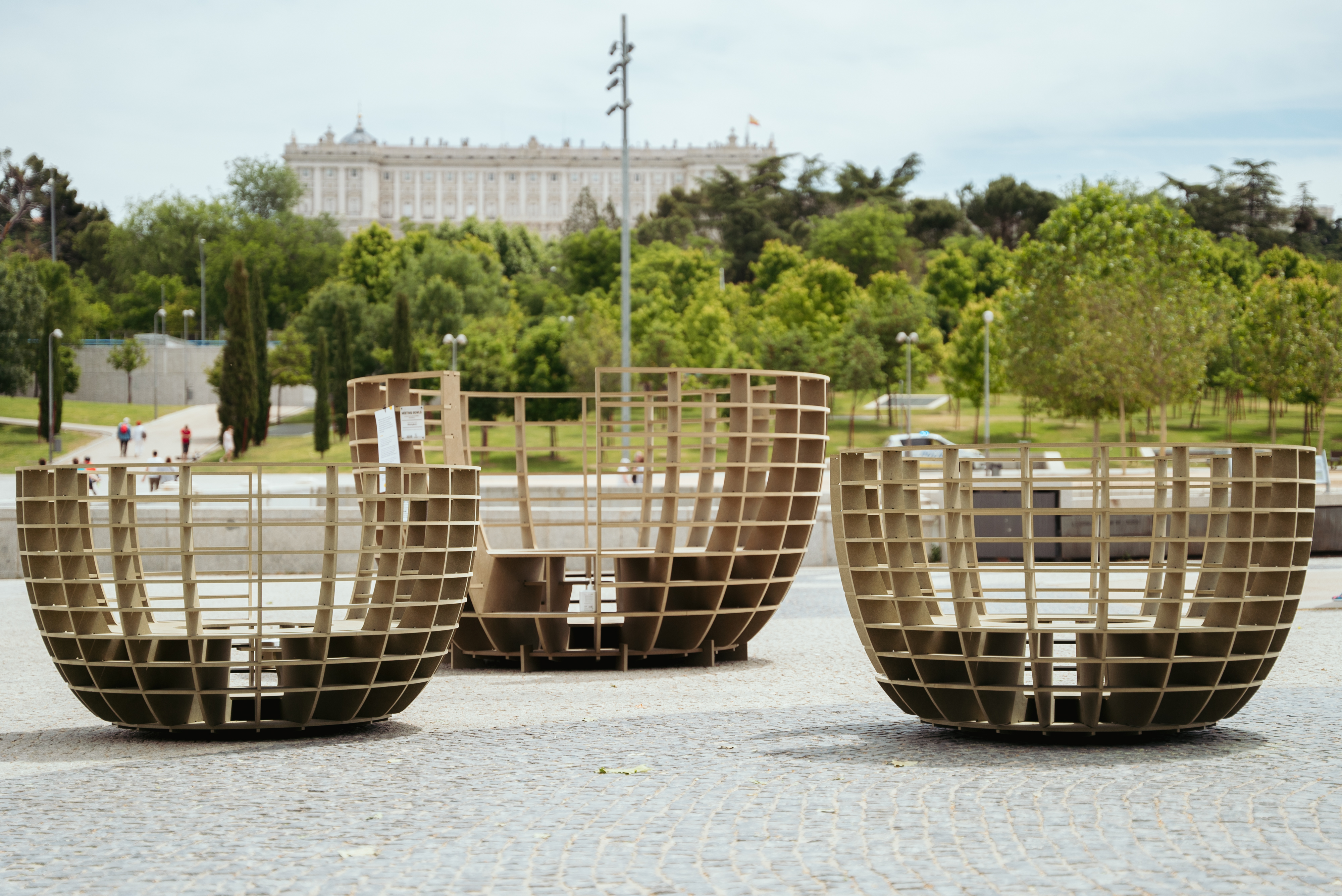 Nos acordamos de mmmm… y su proyecto de los “Meeting Bowls” que anteriormente había pasado por Times Square en Nueva York, el Design District de Miami y por la ciudad de Arlington en Virginia, y que sin embargo aún no se habían presentado en España. Así es como estos columpios en forma de cuenco realizados en madera aterrizaron en la Explanada Puente del Rey en Madrid Río en una acción que duraría 10 días – del 21 al 30 de mayo de 2021.